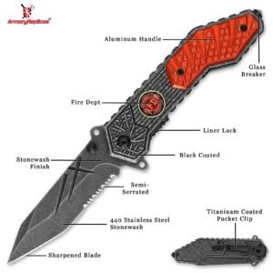 Be prepared for any situation with this versatile folding pocket knife.Razor-sharp blade with a powder-coated black finish and piercing spear point ti