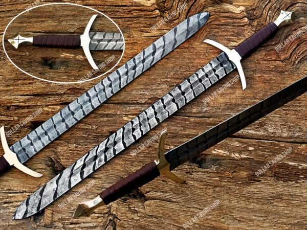 The Damascus Steel Viking Sword is a handmade Norse replica designed by rambladesca, featuring a stunning brown leather sheath. Made from high-quality