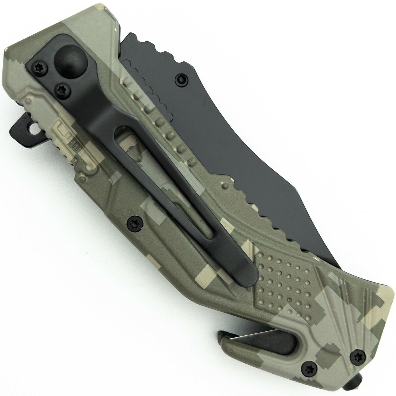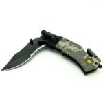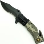 Discover the ultimate companion for survival and emergencies with the POCKET Folding Blade Tactical Knife. This versatile knife combines a sharp, 3.75-inch clip point blade with a partial serrated edge for cutting through tough materials like rope and burlap. Its spring-assisted design ensures effortless one-handed opening, making it quick to access when seconds count. Equipped with a glass breaker and seatbelt cutter, it’s perfect for rescue situations. Plus, the built-in LED flashlight offers vital illumination. The stylish camo handle, complete with a pocket clip and US Army emblem, enhances functionality and portability. Get ready for any challenge with this heavy-duty tool!