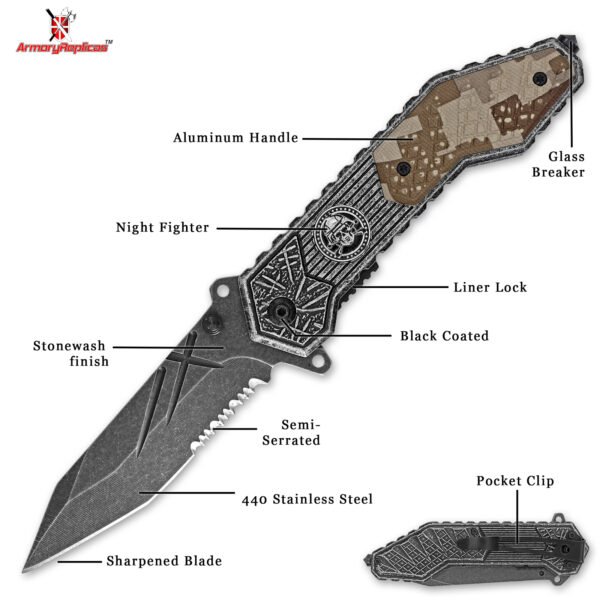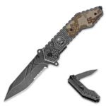 Rugged in appearance the Assisted Action Nightfire Military Pocket Knife is a must have for any military personnel.  Made of stainless steel with a stone finish and partially serrated tanto blade you cannot beat this deal.  The black stone finish is great as it protects the blade from rusting and to reduce glare. This knife is solidly built with double walled steel frame adds to the durability and integrity of the knife.  The handle is constructed of zinc aluminum with a decorative urban camo plates and a military emblem set into the handle. You can keep this great tool around and with the steel pocket clip you can keep it snug right inside your pocket.  The best feature on this blade is the glass breaker just in case of emergencies.
