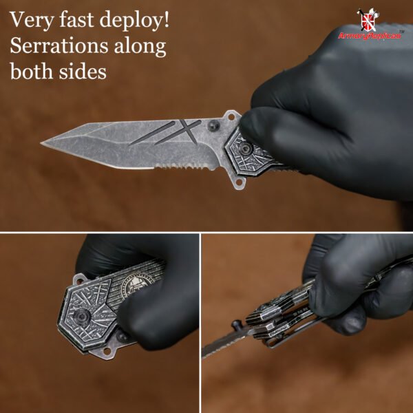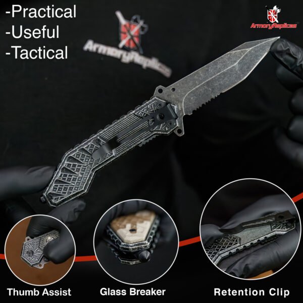 • Blade Type: Modified Tanto, Partial Serration, Thumb Stud