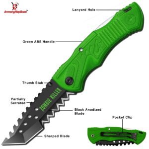 Made from 440 stainless steel with a black anodized finish, this Killer is a much needed companion on your next hunt. Sporting a partially serrated tanto style sawback blade and a thumb stud to assist with opening, the knife has an extremely strong reinforced point that is very good for piercing and stabbing. The handle is made of a heavy duty green ABS that is textured for a firm grip and has a lock back release on top. Included on the handle is a belt clip so you can take your Tanto Blade Killer Pocket Knife with you when you are on the go.